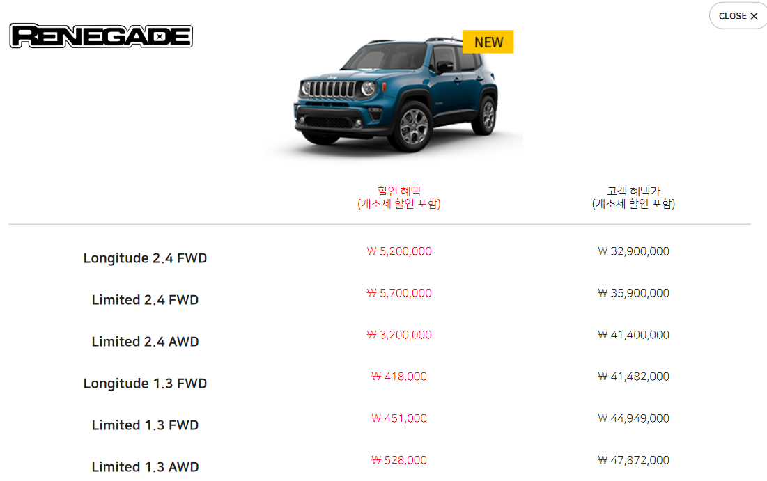 2022 레니게이드 개소세 할인 포함 가격입니다.