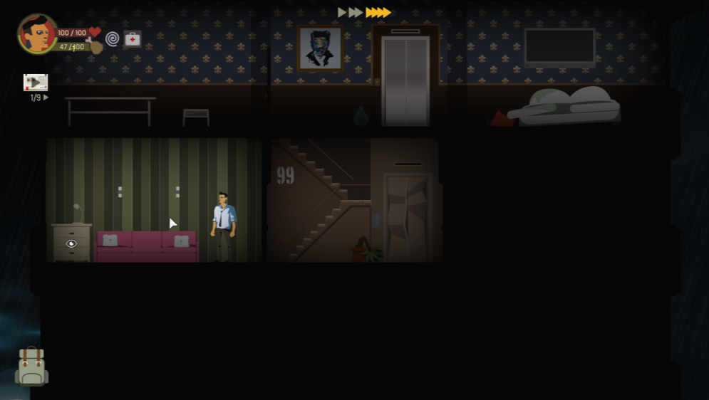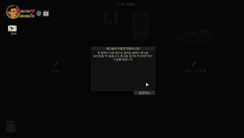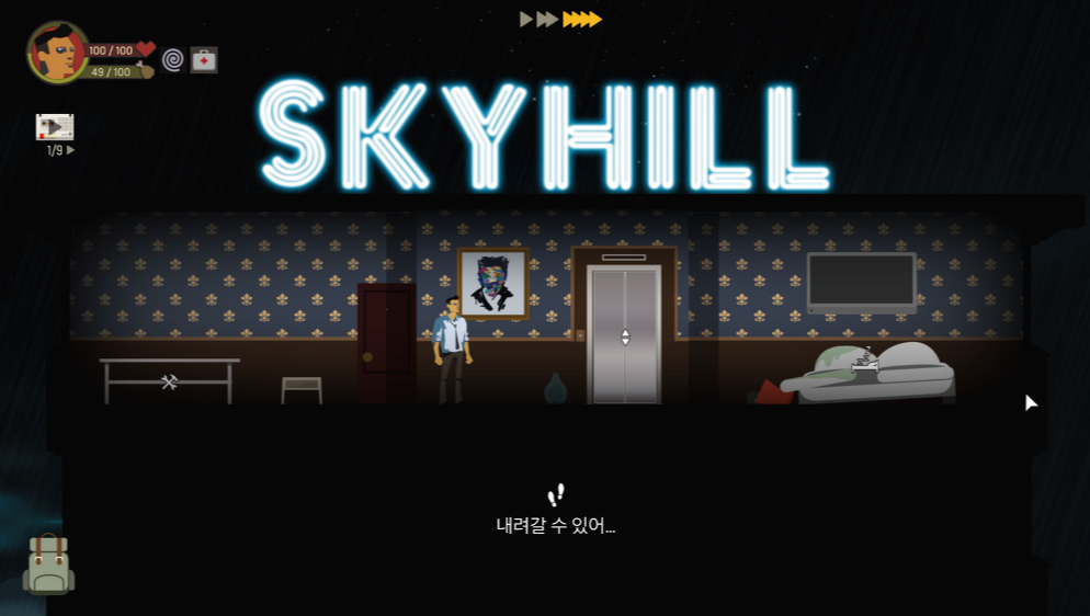 엘리베이터는 방문했던 층으로만 이동할 수 있고, 우측의 침대를 이용하면 HP를 채울 수 있지만 허기지게 됩니다.