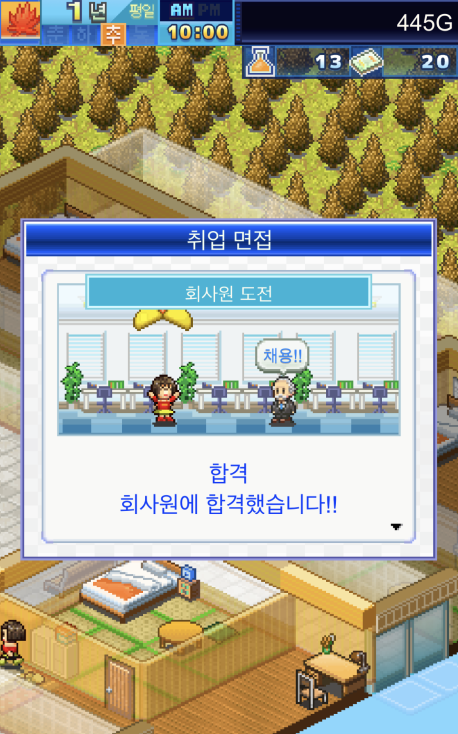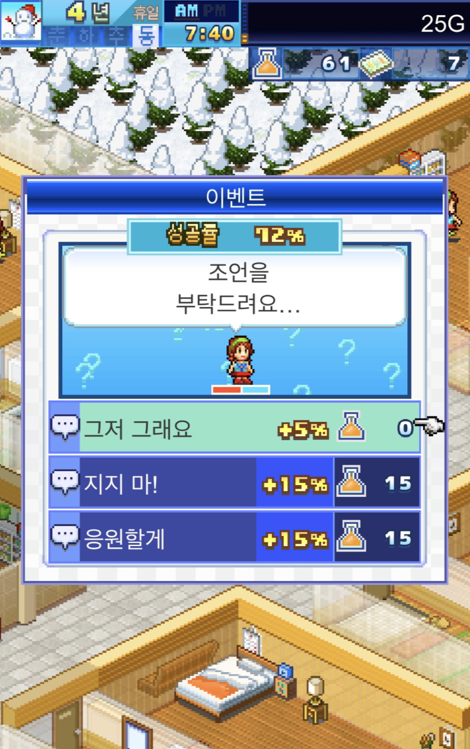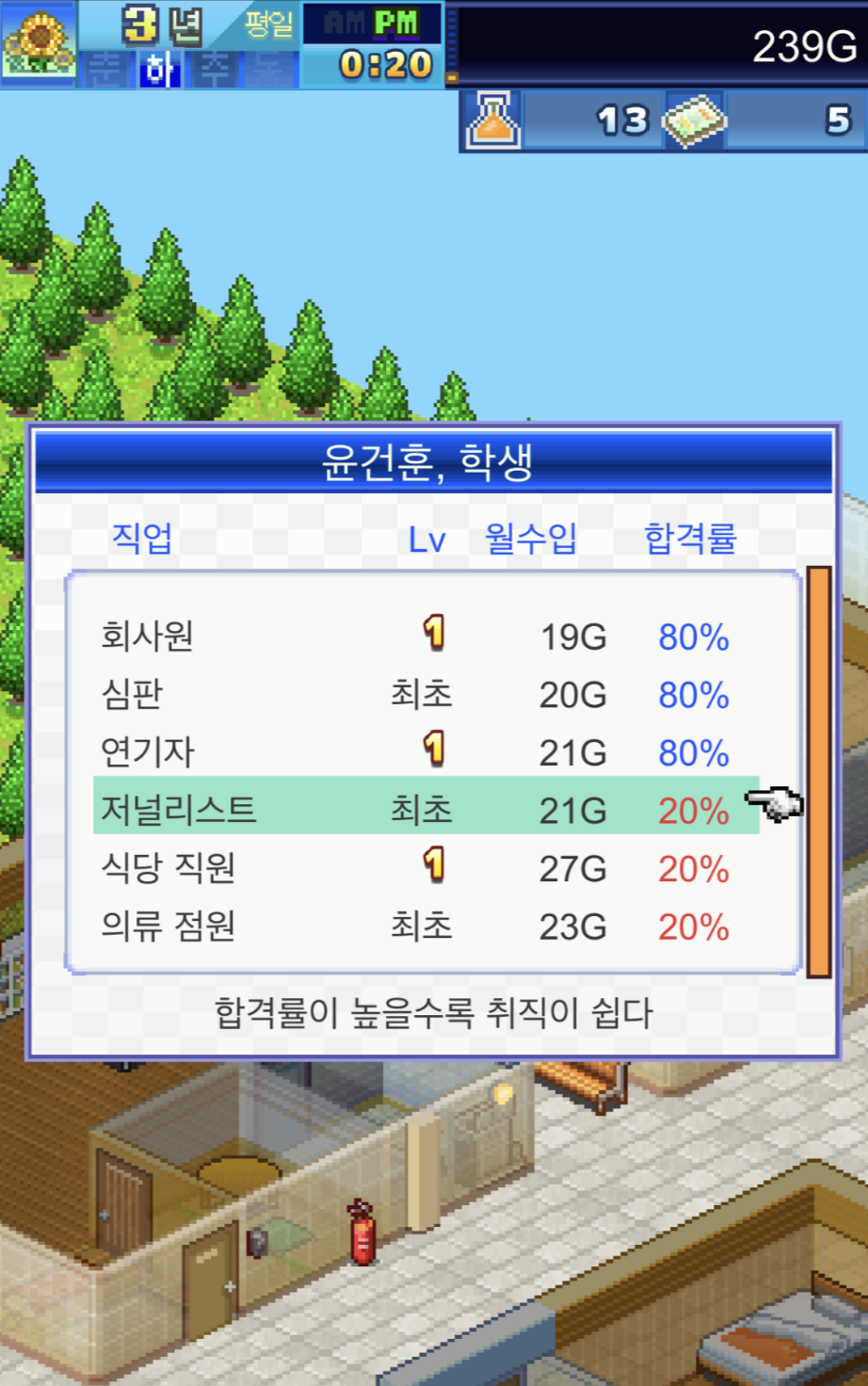 이직은 주민의 능력치에 따라 성공률이 정해지니 주민 개개인의 능력치까지도 신경써줘야되는 세심한 게임입니다.